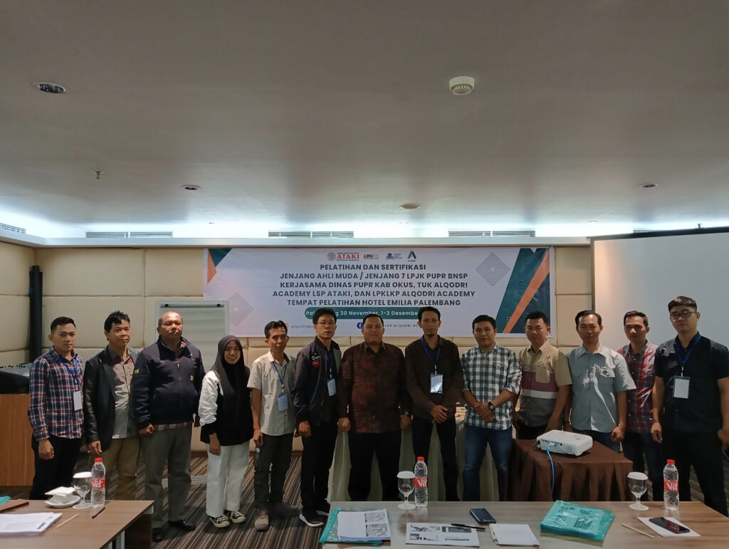 LPKLKP Alqodri Academy bekerja sama dengan dinas PUPR untuk menyelenggarakan Pelatihan dan Sertifikasi Ahli Muda yang diselenggarakan di Hotel Emilia Palembang pada tanggal 30 November – 2 Desember 2023.