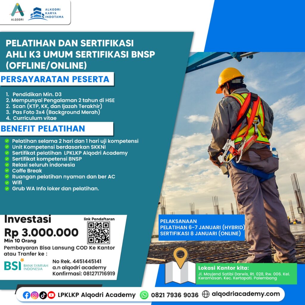 Program ini bisa diikuti dari manapun berada, karena kita menyiapkan program hybrid pelatihan dan uji kompetensinya, jadi bisa ikut online via zoom maupun di kampus alqodri academy di Palembang. Jadi, jangan terlmbat mempersipkan diri kita, lambat ambil keputusan, kalah bersaing!, karena yang sahabat yang lain sudah menyiapkan diri mereka dari jauh-jauh hari, kita saja untuk pelatihan dan sertifikasi operator k3 umum kali ini sudah di angkatan ke 13 dan ahli K3 umumnya sudah diangkatan 12.