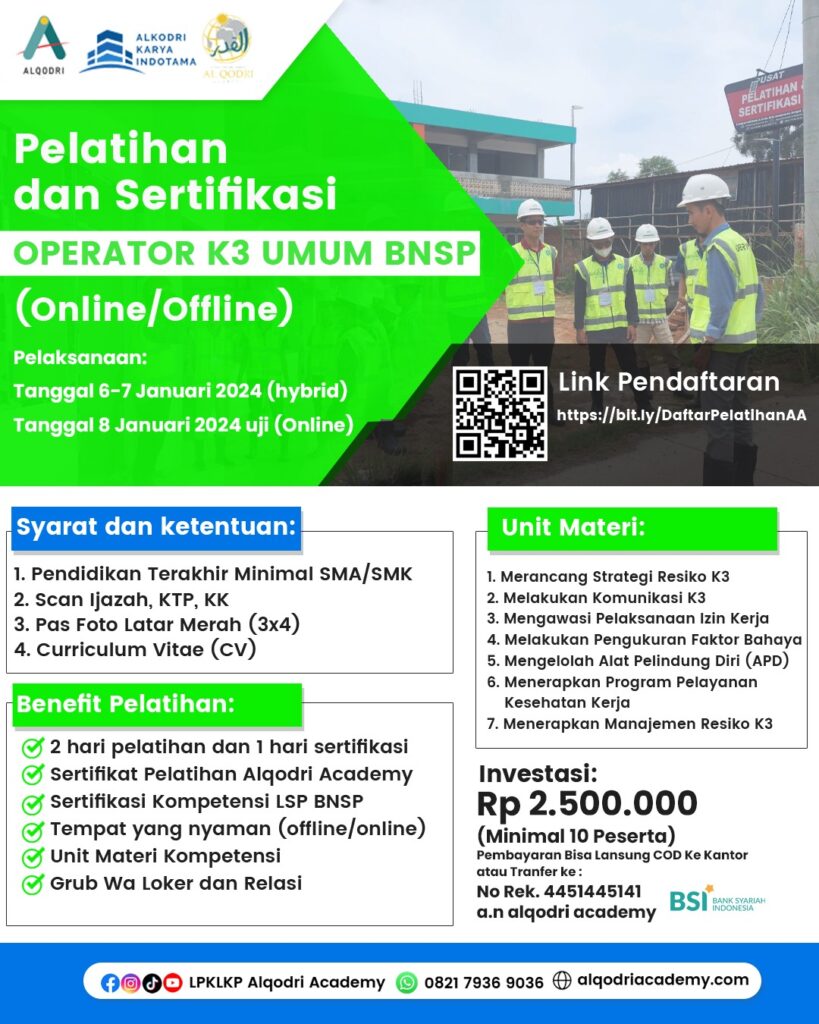 Dunia Usaha dan Industri di Seluruh Indonesia berkewajiban menerapkan K3 ditempat kerjanya, berdasarkan UU No 1 tahun 1970 Tentang Keselamatan kerja dan UU No 13 Tahun 2003 tentang Ketenagakerjaan, Maka pengurus dan pemilik usaha sesuai undang-undang ini akan mencari SDM kompeten bidang K3 untuk mewujudkan aturan tersebut. Oleh karena itu, mari sahabat alqodri academy dimanapun berada mari kita siapkan kompetensi diri kita melalui program Pelatihan Kompetensi dan Langsung Uji Kompetensi Untuk Sertifikasi Operator K3 Umum dan Ahli K3 Umum dari LSP BNSP Awal Tahun 2024 di Alqodri Academy ini.