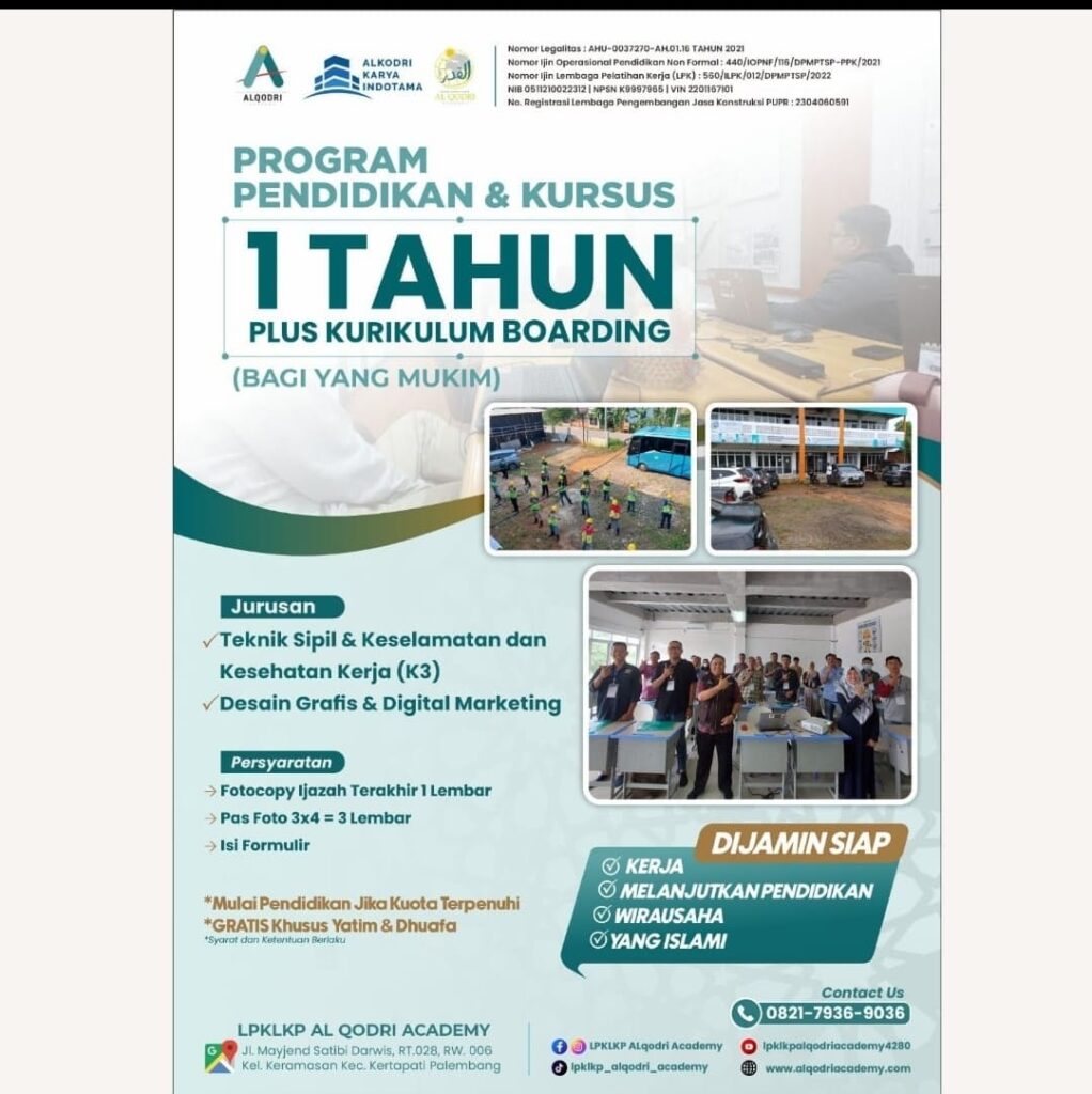 Program Pendidikan dan Kursus Profesi 1 Tahun (Setara D1) di LPKLKP ALQODRI ACADEMY, Menerima Siswa/i baru Tahun ajaran 2024/2025.