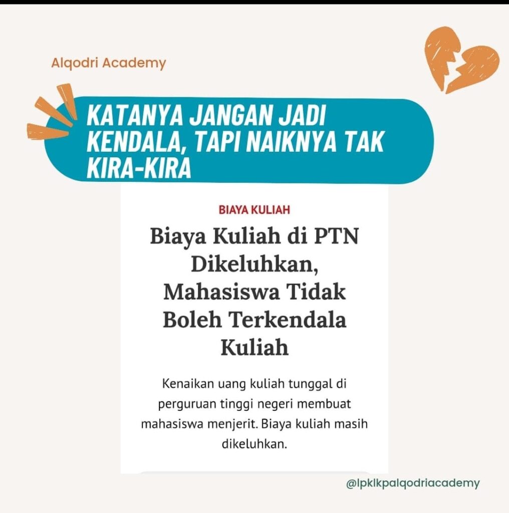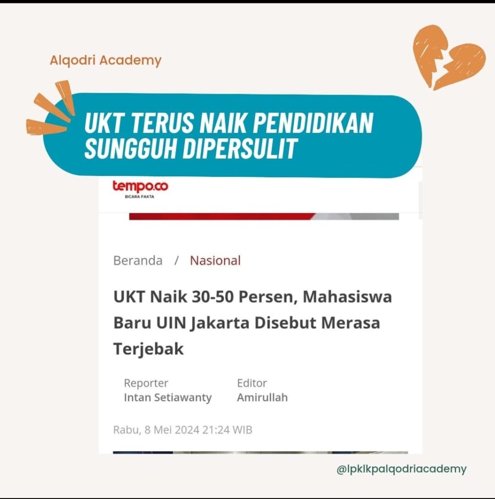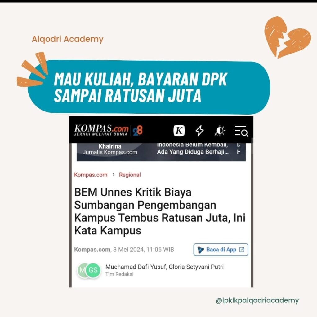 Semakin mahalnya dunia pendidikan tinggi sekarang membuat kami berfikir keras, apa yang bisa kita berikan untuk bangsa dan negara supaya semua anak bangsa bisa ada alternatif pilihan untuk meningkatkan kemampuannya melalui pendidikan, karena kita tahu persis bahwa dengan pendidikan kita akan mampu merubah masa depan. Oleh karena itu kami LPKLKP Alqodri academy, meluncurkan Program Pendidikan dan Kursus Profesi 1 Tahun (Setara D1) di LPKLKP ALQODRI ACADEMY, yang akan Menerima Siswa/i baru Tahun ajaran 2024/2025 tahun ini.